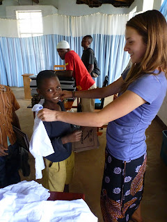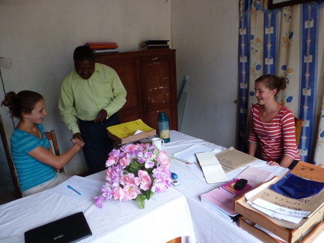 While reviewing sponsored students at Kirefure primary school,the bintis offered an impromptu geography lesson and organized teams for a quickgame of soccer. They have sat in on school meetings and student reviews withpatience and interest. They have been riding dalla dalla’s without anxiety,shoulder to shoulder, knee to knee, hip to hip with villagers. They have beenteaching computer to HBC Augustine Shayo, who has requested computer trainingfrom me for four years and has finally realized a dream. The girls recently worked the Pamoja Tunawezamedical caravan with friend Sidonie, and learned how to use a electronic b/pcuff and screen for high blood pressures! And high some were! At the Kilema OVCprogram they have carried food sacks, measured out beans for distribution, fitted shirts, offered up schoolsupplies and support. A few days agoCaroline and Eva made out bank depositslips and counted shillings (eliminating the most soiled and flimsy) for student tuition payments at the CRDB bank inMarangu and reflected on the generosity of fellow students at Central Middle Schoolwho provided money to send two students toDarajani Secondary School, Daniel and Lucina. Many thanks to Central students!